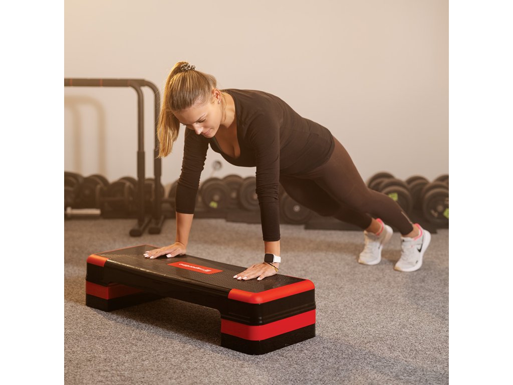 AzinSPORTline AS250 Aerobic step lépcső egy sokoldalú edzőeszköz, amellyel biztosan nem fogsz unatkozni! A szilárd, csúszásmentes felületű műanyag megbízható támasztékot jelent nem csak az aerob edzés során. A két pár levehető alsó panelnek köszönhetően a lépcsőmagasság 10, 15 vagy 20 cm- re állítható. A lábak csúszásmentes gumival vannak ellátva, így edzés közben is stabilan végezheted a gyakorlatokat.