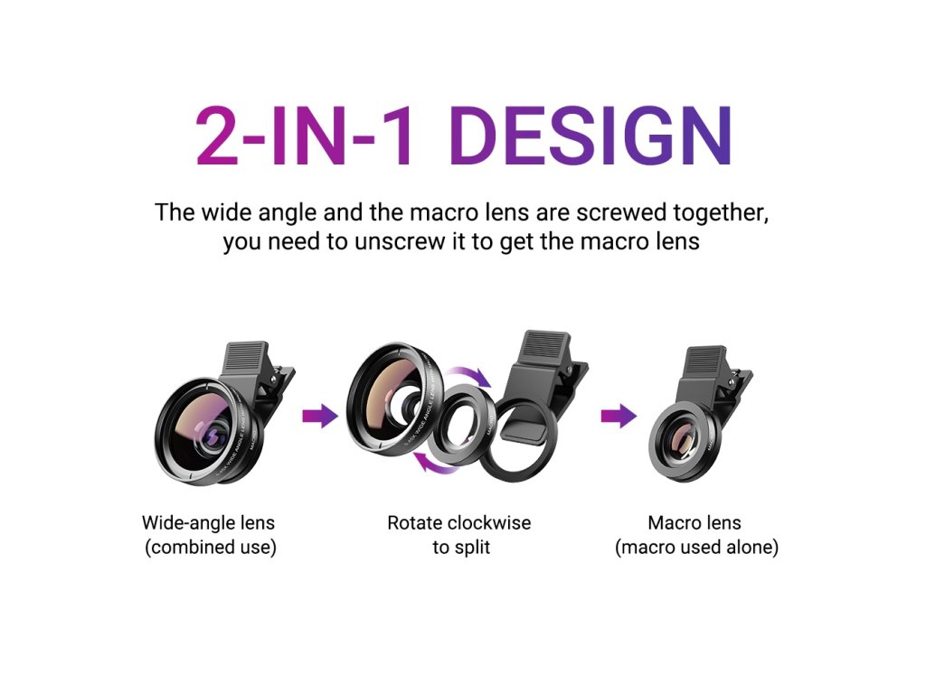 Az univerzális csíptethető rögzítés a telefonok túlnyomó többségével működik, és karcolásgátló betétekkel van ellátva. A nagylátószögű objektív egyszerűen rácsavarozható a makró részre – vedd le a felső fedelet, és máris kész a makró. Kompakt mérete és könnyű súlya ideális kiegészítővé teszi utazáshoz és a városba.
