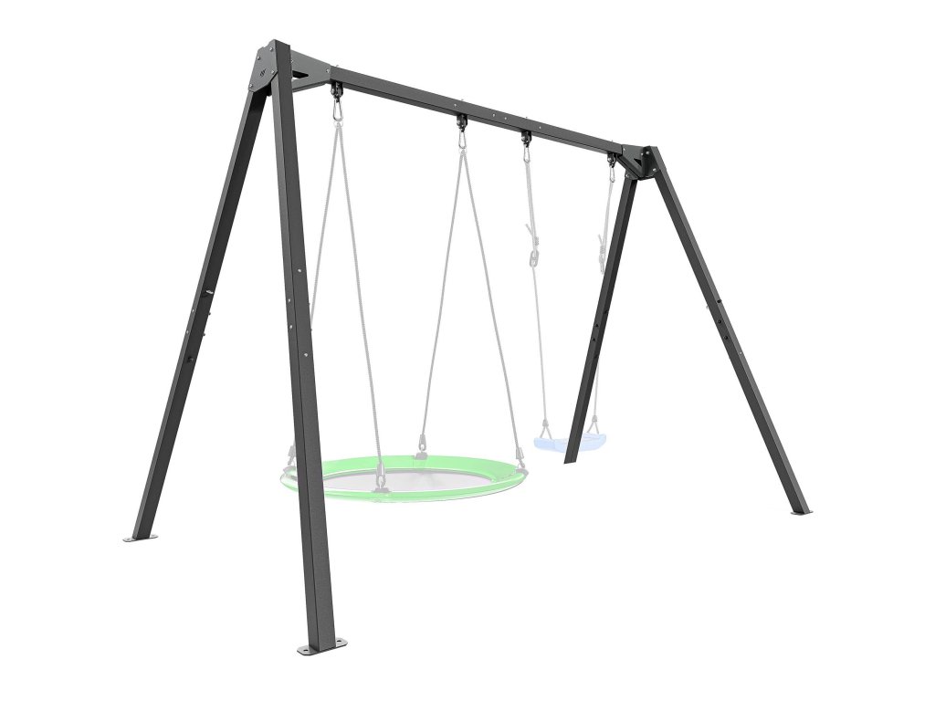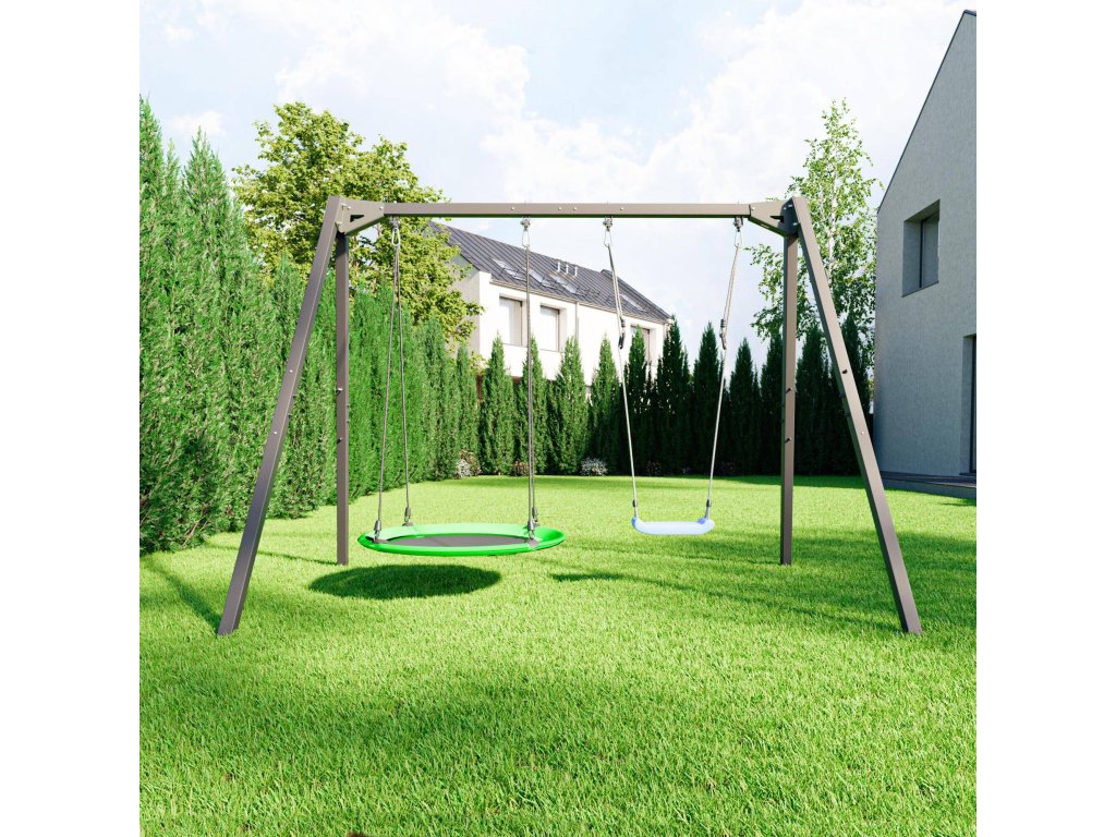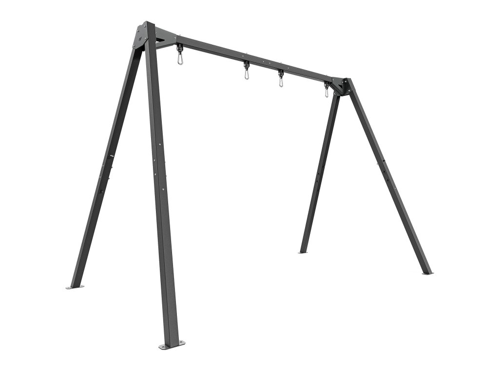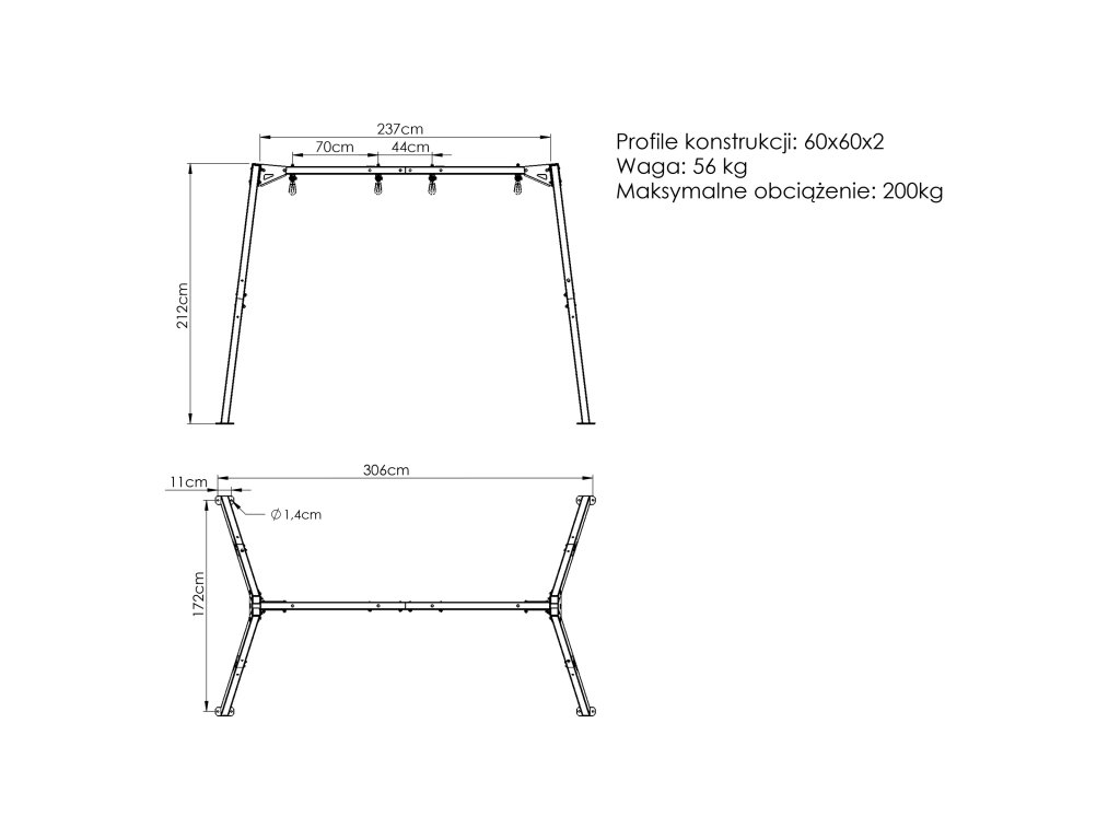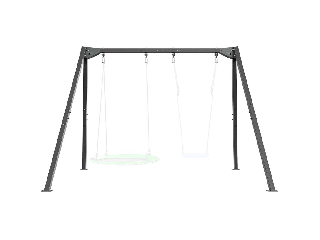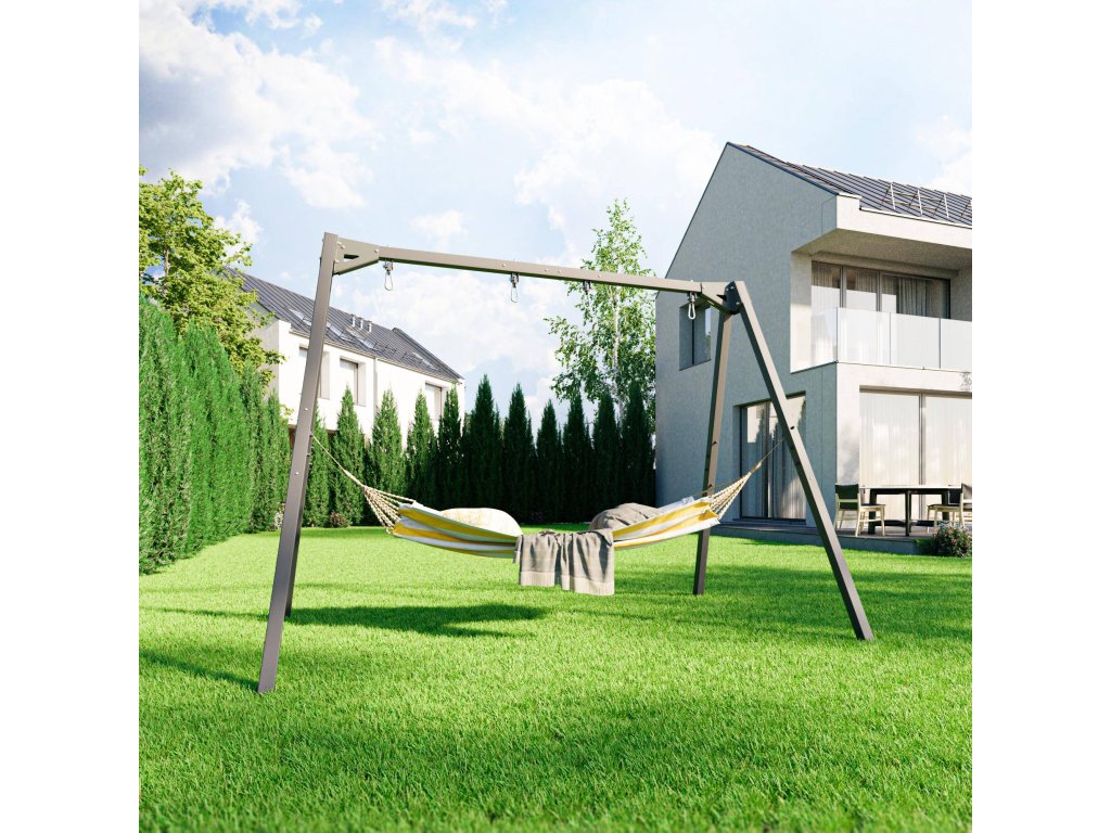 A dupla hintához kínált acélkeret tartós és biztonságos konstrukció. A 60x60x2 mm keresztmetszetű, kiváló minőségű acélból készült profilok garantálják a biztonságos használatot. A keret stabilitását ezenfelül a lábak és a keresztrúd közötti megerősítés biztosítja egy megfelelően hajlított rögzítőelem formájában.