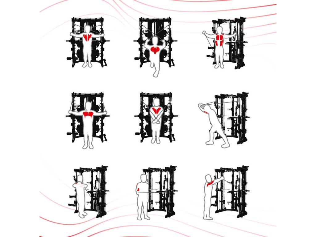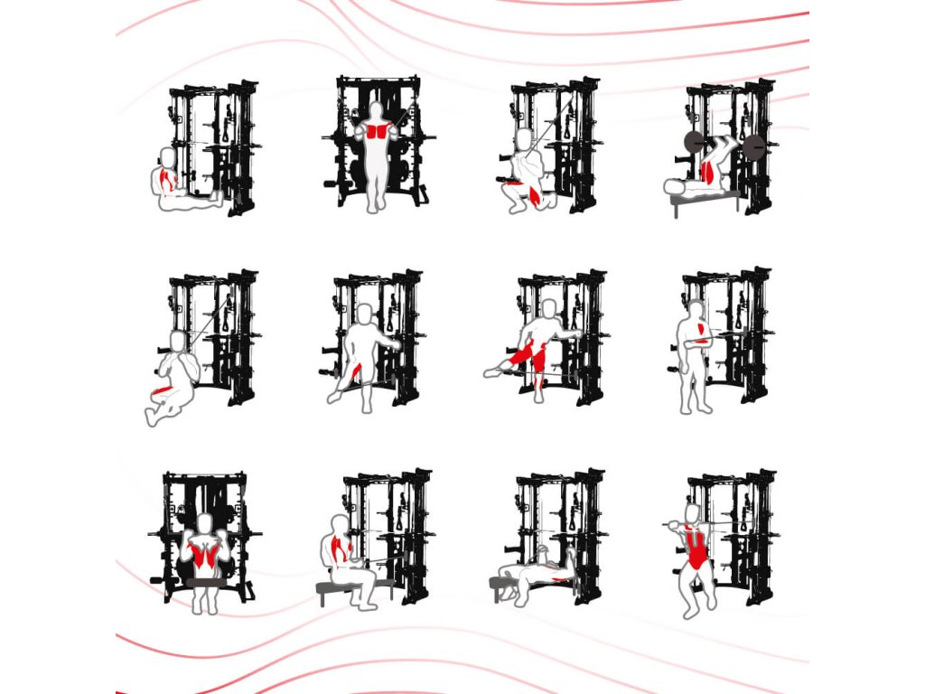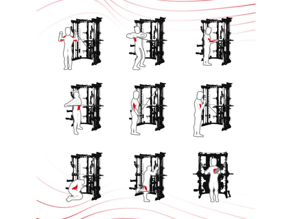 Az erőkerethez tartozik még az 5 pozícióba állítható multifunkciós húzódzkodó is, a súlyok és kiegészítők számára fenntartott rész, és az expanderek és erősítők számára kialakított kampó. Ezeknek köszönhetően ez az erőkeret egy modern edzőterem alapfelszerelése.