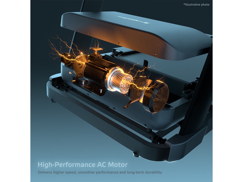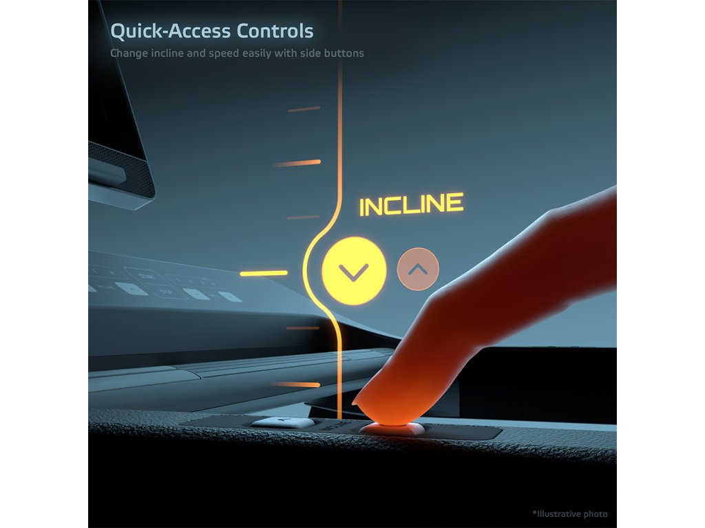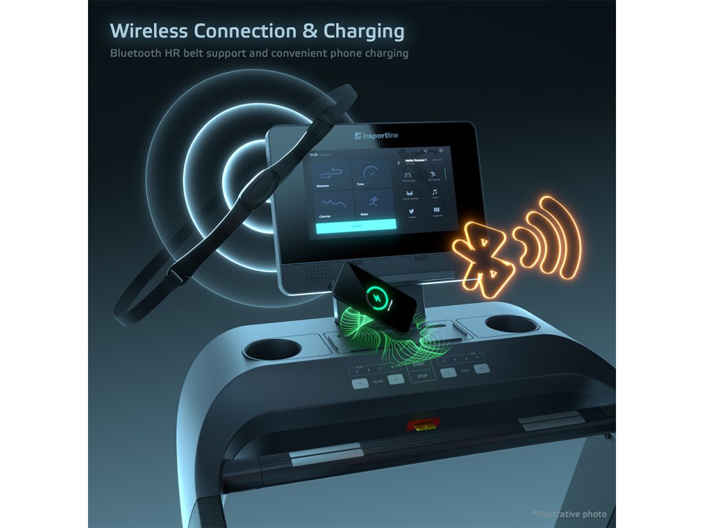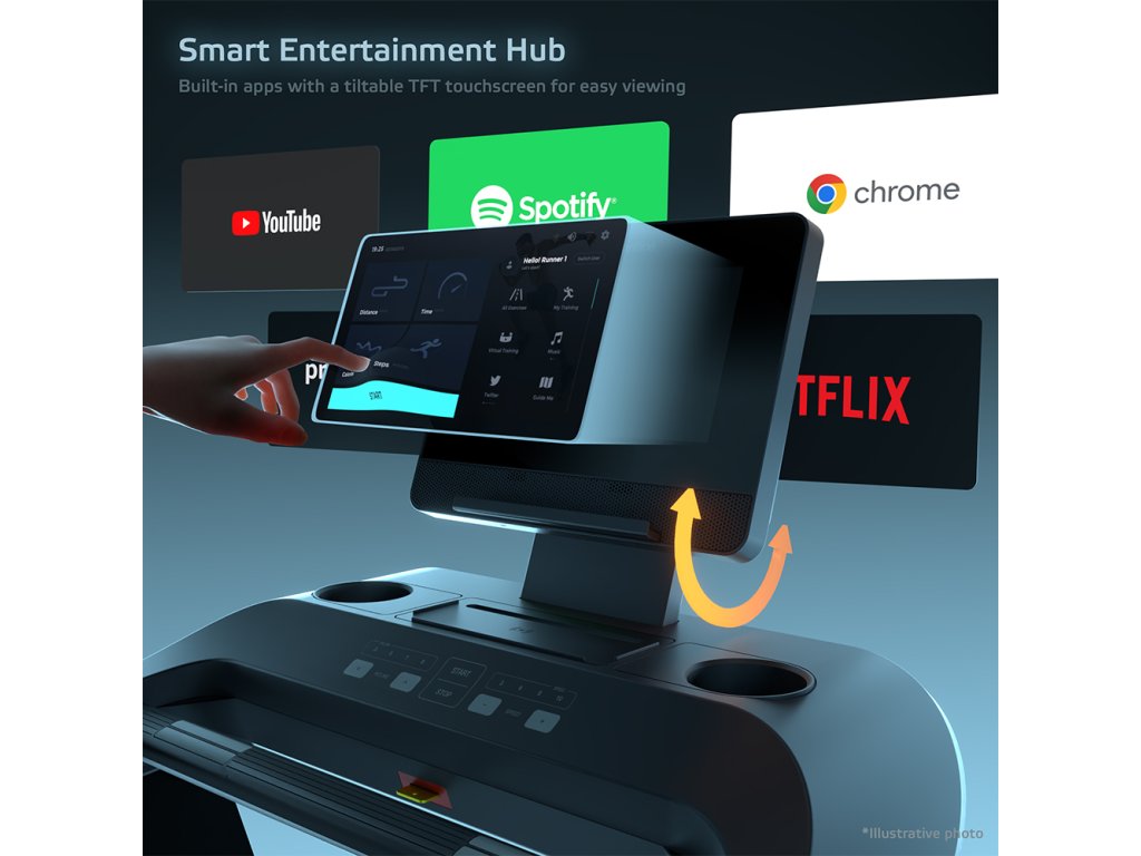 Már első pillantásra lenyűgöz a 15,6"-os TFT érintőképernyős kijelző, amely nemcsak arról gondoskodik, hogy minden edzésadatot jól áttekinthess, hanem edzés közben is szórakoztat téged. Az olyan előre telepített alkalmazások, mint a YouTube, a Netflix, a Spotify, a Facebook, a Chrome és a Prime Video minden percet élvezetessé tesznek a szalagon. Természetesen van Bluetooth-kapcsolat a fejhallgatóhoz, vezeték nélküli és USB-s telefontöltés, valamint Touch & Run vezérlők a fogantyúkon a gyors dőlésszög- és sebességbeállításhoz.