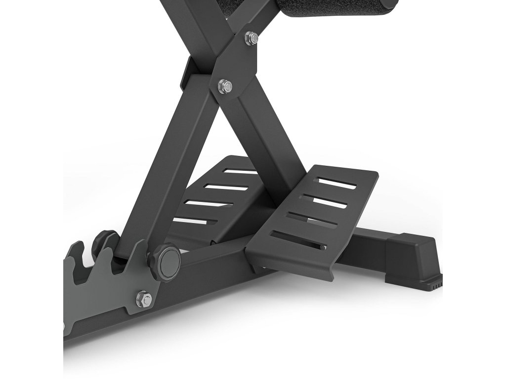 - lehetővé teszi a háttámla szögének 3 fokozatban történő beállítását - ez egy innovatív megoldás, amely lehetővé teszi az edzés intenzitási szintjének és kifinomultságának beállítását. A háttámla beállítható vízszintesebb helyzetbe, hogy növeld a terhelést az edzés során, vagy függőlegesen, hogy csökkentsd azt. Ennek az újdonságnak köszönhetően különböző edzési célokat érhetsz el, és egyetlen eszközön végezhetsz gyakorlatokat mind a hátizmok, mind a hasizmok erősítésére;