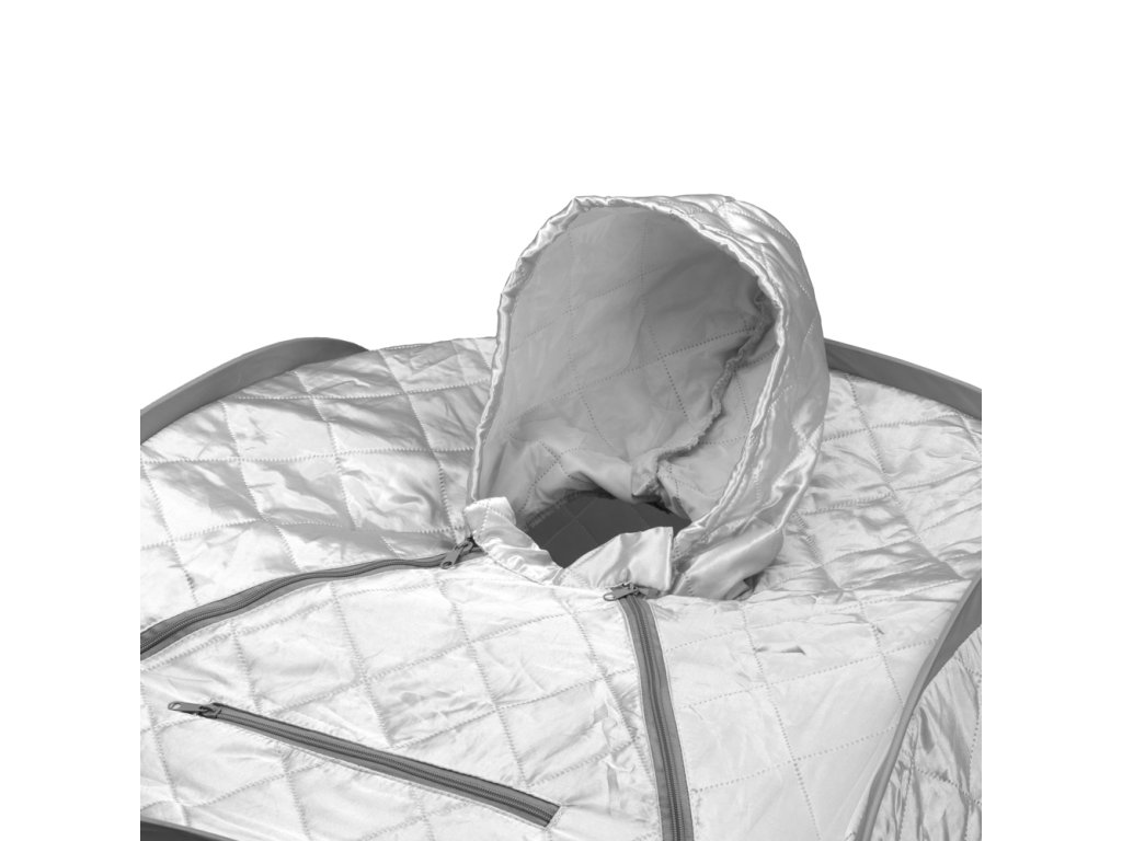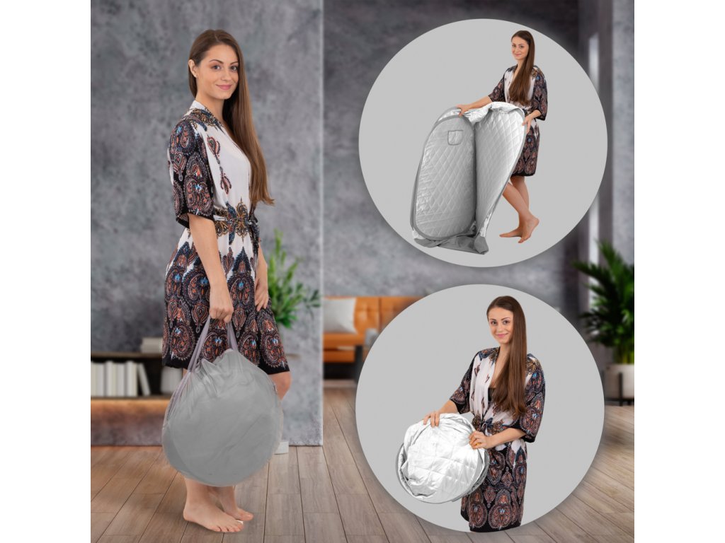 A kétoldalas cipzáraknak köszönhetően kényelmesen be- és kiléphetsz a szaunából. A praktikus cipzárral nyitható karnak kialakított részeket mindenki értékelni fogja, aki szaunázás közben könyvolvasással vagy tableten videózással szeretné eltölteni az időt. A szauna elhelyezése vagy összeszerelése teljesen egyszerű, bárki számra használható pillanatok alatt. A pop-up rendszer gondoskodik arról, hogy csak ki kelljen venned a szaunát a táskájából, és néhány másodperc alatt már élvezheted a jól megérdemelt kikapcsolódást! A kompakt kialakításnak köszönhetően kis helyekre is ideális! Csak néhány gyors mozdulat, és már tárolhatod a szaunát az ágy alatt vagy a szekrényben. Ezenkívül a csomag tartalmaz egy összecsukható széket, amely ellenáll a nedvességnek.