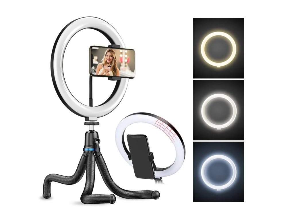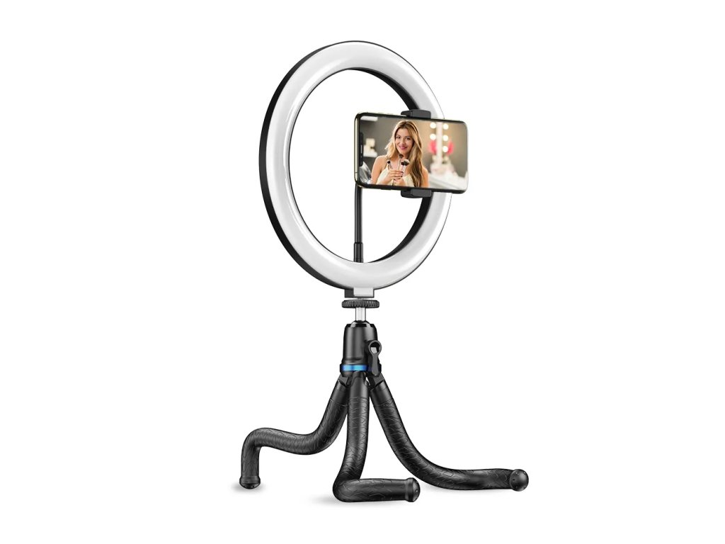 Az Apexel 10" kör alakú LED lámpa rugalmas állvánnyal egy rendkívül praktikus kiegészítő fotózáshoz, videózáshoz, online hívásokhoz vagy sminkeléshez. Kör alakú kialakításának köszönhetően egyenletes fényt biztosít éles árnyékok nélkül, egységesíti az arcszínt és élettelivé teszi a tekintetet. Kiváló választás szelfikhez, portrékhoz és közösségi média tartalomgyártáshoz – akár okostelefonnal, akár fényképezőgéppel dolgozol.