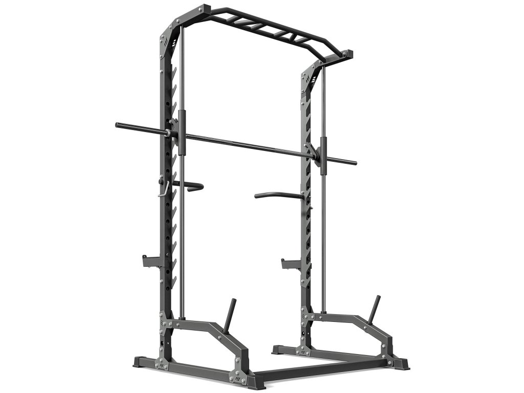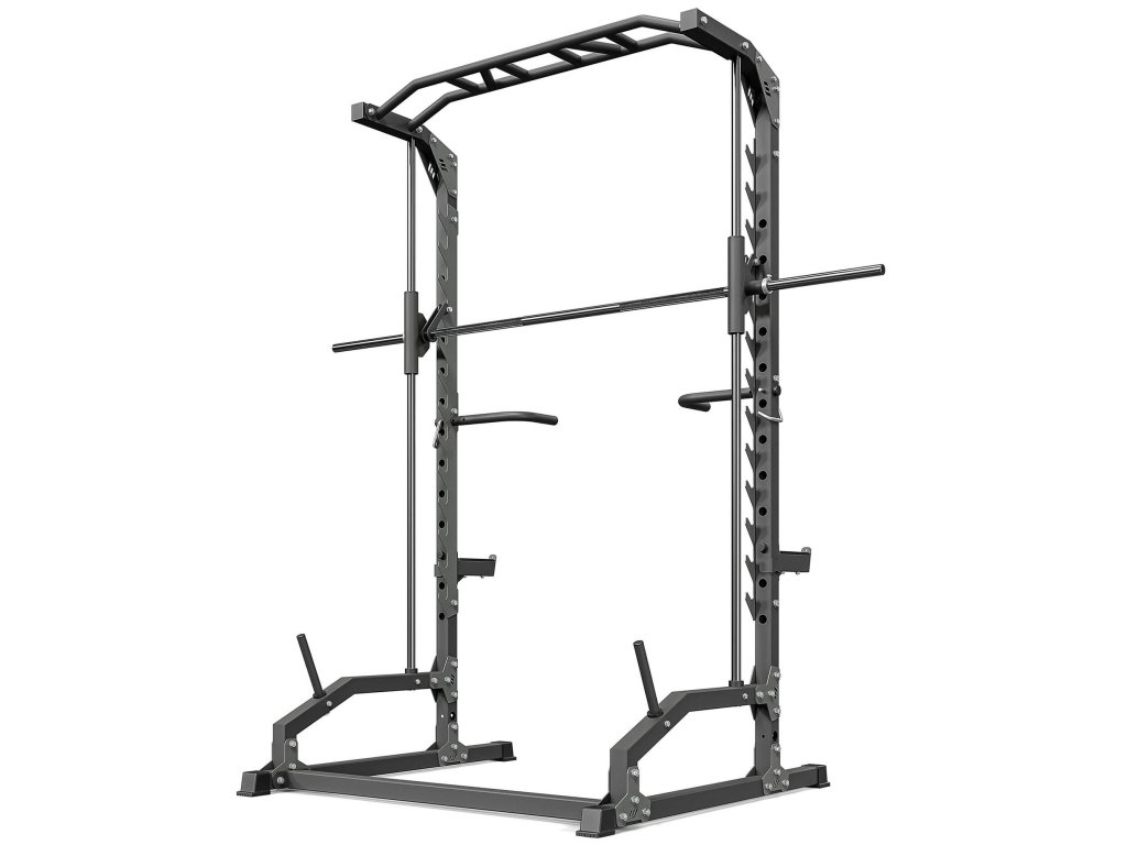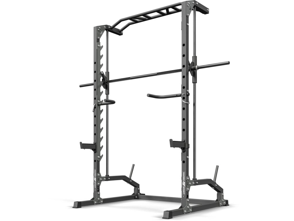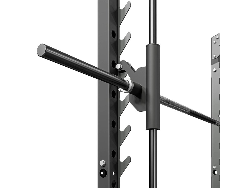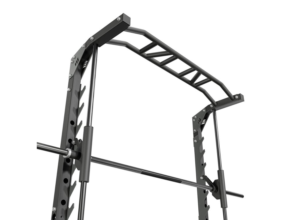 A szabadsúlyt kihasználva ez a kialakítás egy súlyzó és egy dupla függőleges erősítő kombinációja. A kiváló minőségű csúszók biztosítják a zökkenőmentes mozgást az edzés során, a speciálisan kialakított tartók pedig lehetővé teszik, hogy a súlyt könnyedén letehessed a 13 magassági szint egyikén - csak forgasd el a csuklódat a súlyzó rögzítéséhez. Az MS-U105 2.0 csúszkákat ütközők védik, amelyek megóvják a csúszkát a sérüléstől, ha a súlyzót anélkül ejted le, hogy előbb rögzítenéd. A Smith-gép a felső és alsó izmok gyakorlatainak széles skáláját biztosítja.