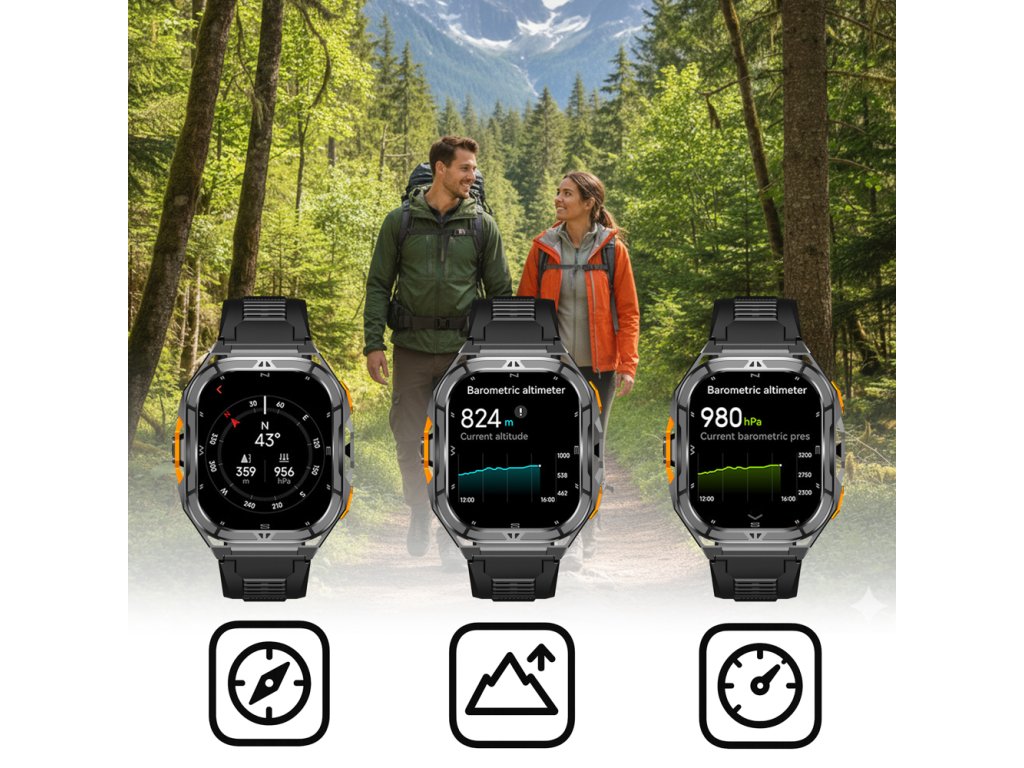 - funkciók: edzés, edzésnapló, pulzusszám és vérnyomás, alváskövetés, vér oxigénszintjének ellenőrzése, időjárás, zene, üzenetek, ébresztőóra, légzőgyakorlatok, stresszszint ellenőrzése, érzelmek, percenkénti légzés, stopperóra, időzítő, számológép, naptár, menstruációs ciklus követés, AI asszisztens, telefonkeresés, iránytű, barométer, magasságmérő