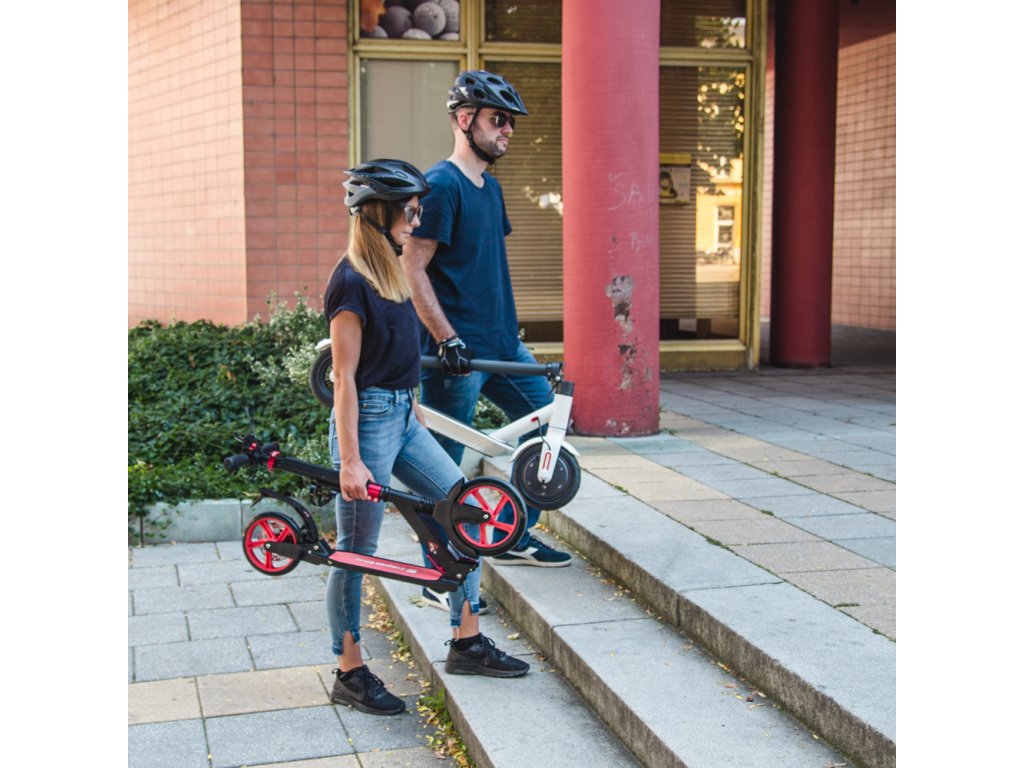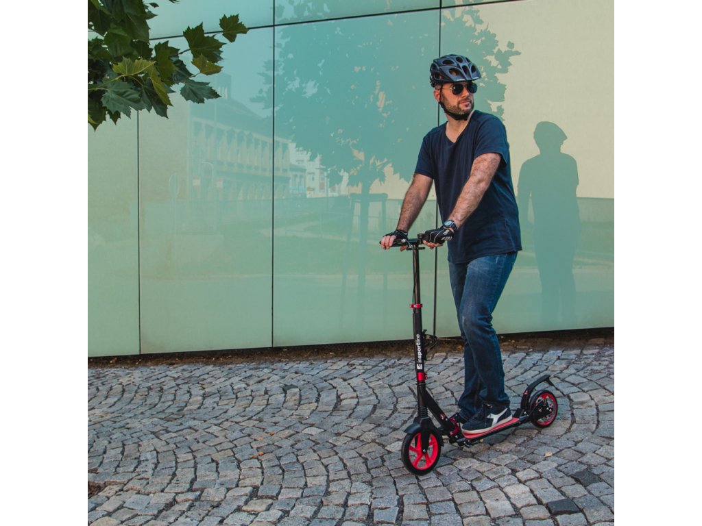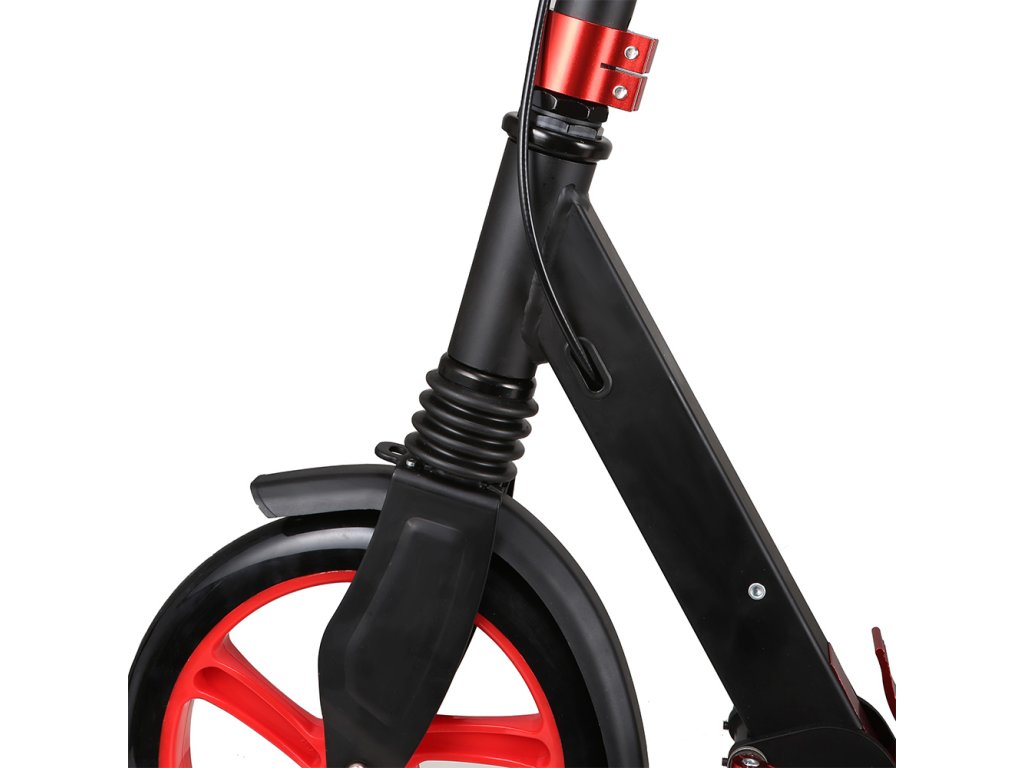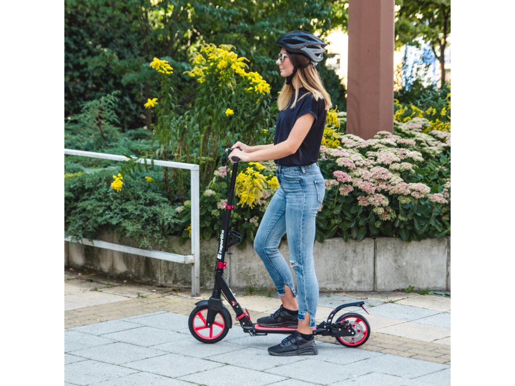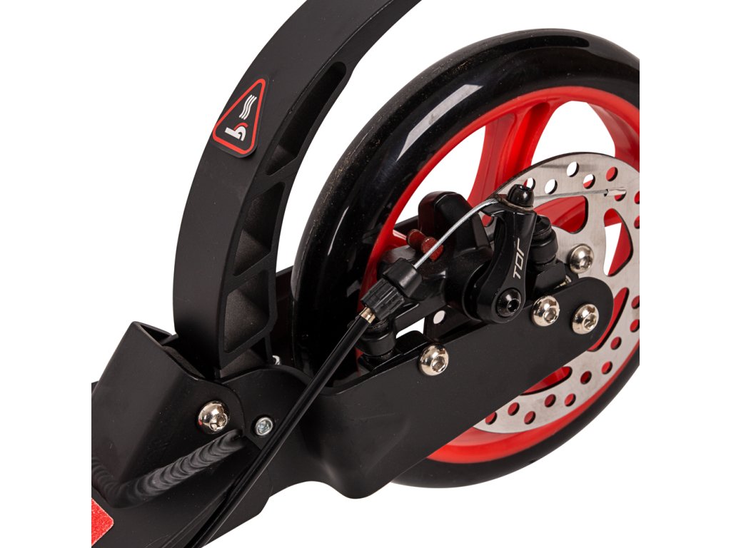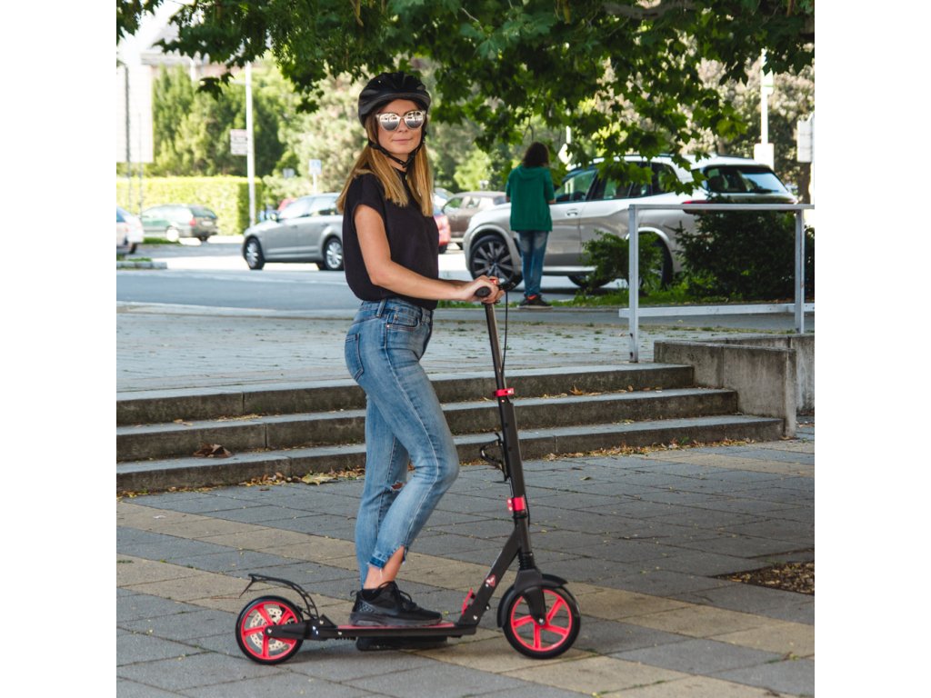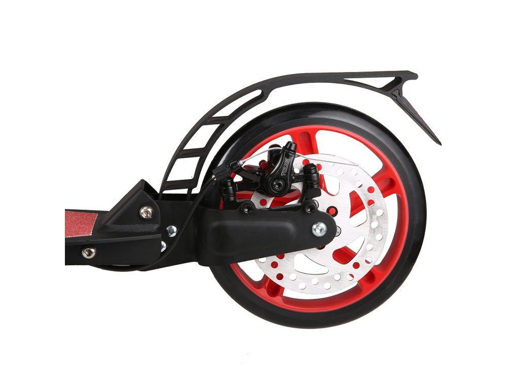 A felfüggesztési rendszer és a szilárd elülső villa biztosítja, hogy egyenetlen utakon is kényelmes legyen a rollerezés. Az állítható kormánymagasság és a 230/200 mm-es kerekek azonban a rollert elsősorban aszfaltra teszik alkalmassá. A csúszásgátló fellépőlap, a csengő, a sárvédők és a fent említett hátsó tárcsafék gondoskodik a biztonságos rollerezésről. Ha csak óvatosan, lassan kell fékezned, akkor használhatod a taposóféket is. A hátsó sárvédőn lévő gumis meghosszabítás megvéd a felfröccsenő víztől. Továbbá reflektorral is felszerelt, amely javítja a láthatóságot gyenge fényviszonyok között.
