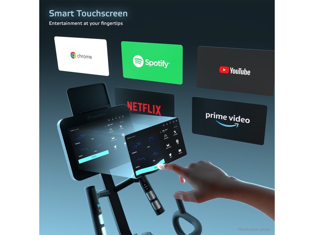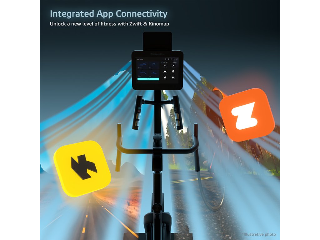 A nagyméretű, 10,1"-os TFT-kijelzőn jól látható az idő, a sebesség, az átlagsebesség, a távolság, a kalória, a fordulatszám, a pulzusszám és a teljesítmény. Az inSPORTline ZenRoute 300 szobakerékpár csatlakoztatható a Zwift, Kinomap vagy FitShow alkalmazásokhoz, így nemcsak videós edzéseket, hanem valós idejű versenyeket is élvezhetsz más felhasználókkal. Emellett olyan előre telepített alkalmazásokat is kínál, mint a YouTube, Netflix, Spotify, Chrome, Prime Video vagy az X.