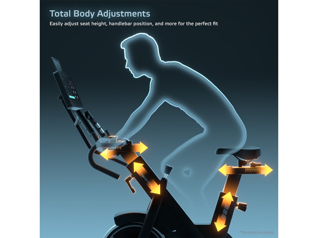 A nyereg és a kormány függőlegesen és vízszintesen is állítható, így könnyedén testre szabhatod az ideális üléspozíciót. A többfunkciós fogantyúk többféle fogást tesznek lehetővé, a klipszes és pántos pedálok pedig stabil tartást biztosítanak. Az olyan praktikus részletek, mint a szállítókerekek, a talajkiegyenlítő rendszer és a vészfék, a gép professzionális kialakítását hangsúlyozzák.