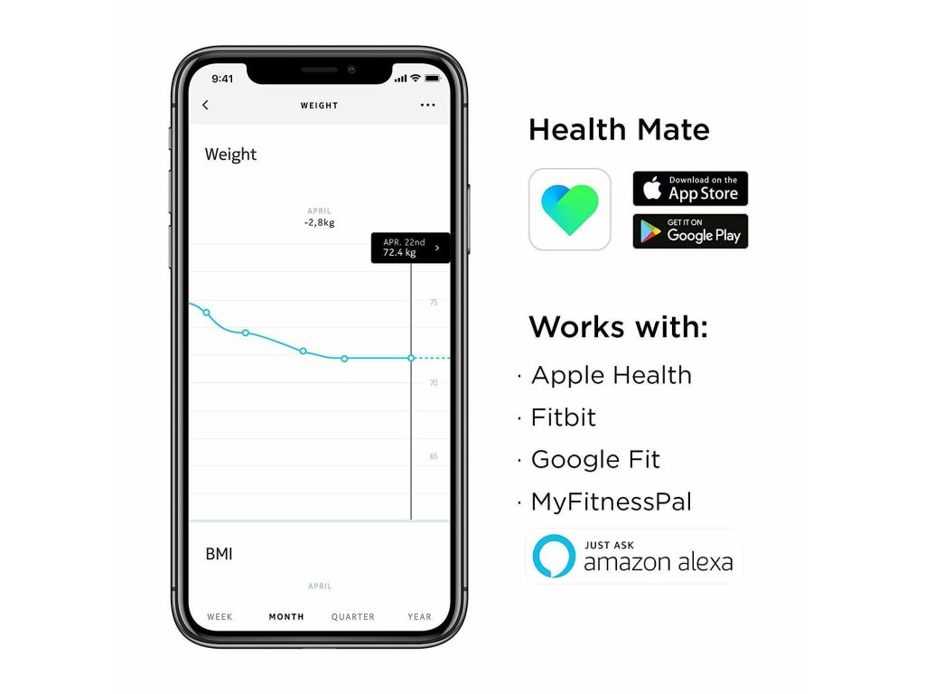 A Body BMI Wi-Fi egy intelligens mérleg, amely súlyt, BMI-t és Wi-Fi-n keresztüli automatikus szinkronizálást tartalmaz az ingyenes Health Mate alkalmazással, ahol megtekintheted a trendeket, és további motivációt találhatsz céljaid eléréséhez. Állíts be súlycélt, és ellenőrizd napi kalória-beviteledet. Ez az intelligens mérleg szinkronizálható az Apple Watch-csal, valamint több mint 100 legjobb egészségügyi és fitnesz-alkalmazással, beleértve az Apple Health-t, a Fitbitet és a Google Fit-et. Nagy, könnyen áttekinthető felhasználóbarát kijelző, 2,4 x 1,6 hüvelyk, 128 x 64 pixel, kontrasztos világítással.